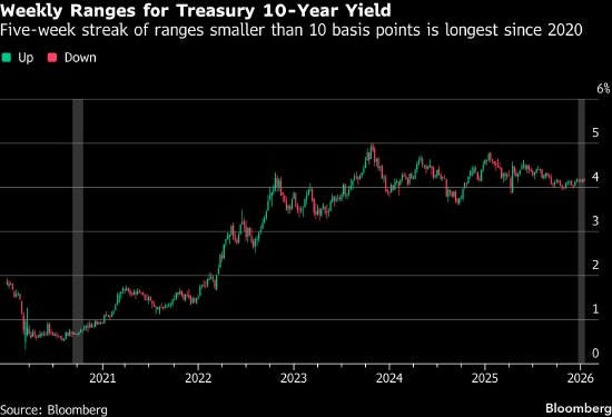 10年期美国国债收益率即将迎来连续第五周的微幅波动,这一惯性持续时长堪比过去二十年来的最高纪录。