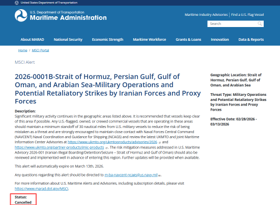 据美国海事管理局官网显示,这一被取消的预警原定于3月13日到期。