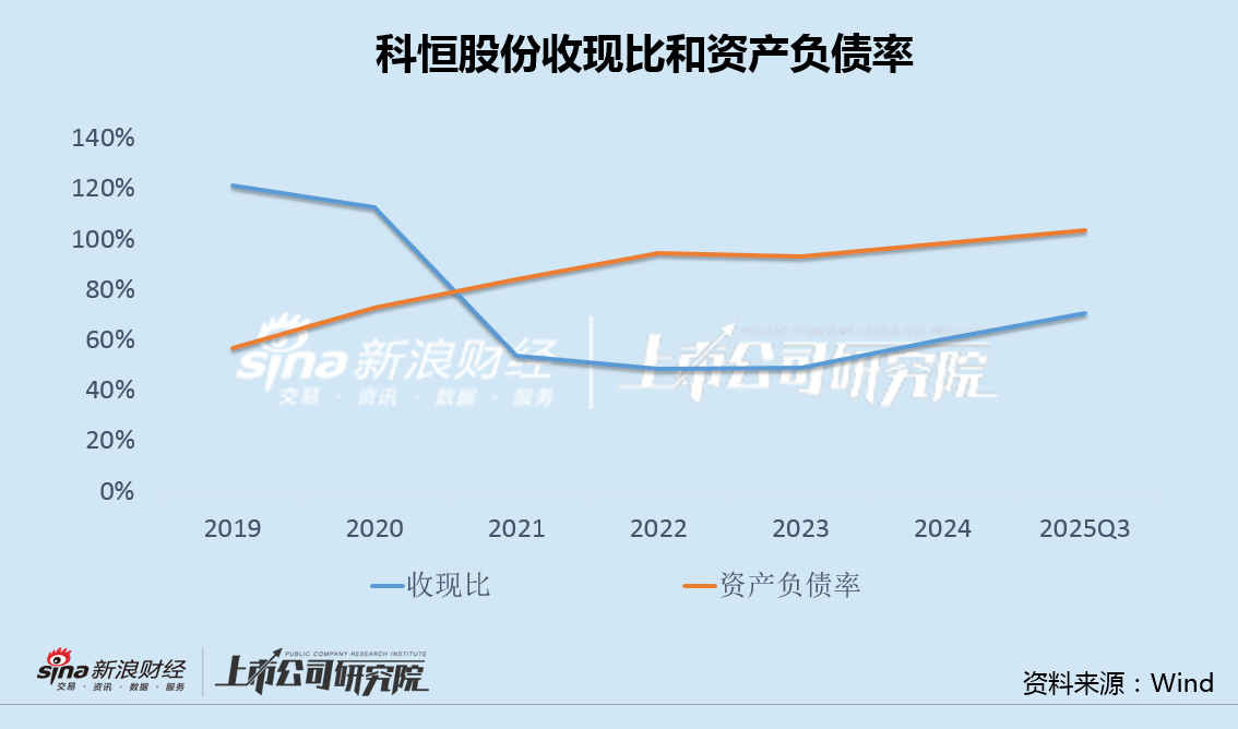 2021年以来,公司收现比长期徘徊在70%以下的低位;截至2025年三季度末,公司负债率已升至103%的新高,已陷入资不抵债的境况。